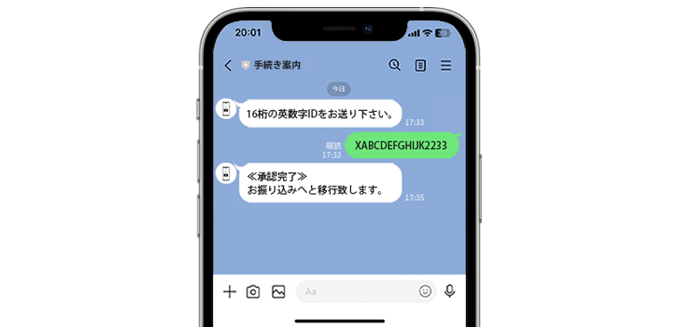 - 1. Xから始まる16桁のコード(英数字ID)をトークルームにて送信してください。(コードが映っている部分を写真に撮って送信も可)